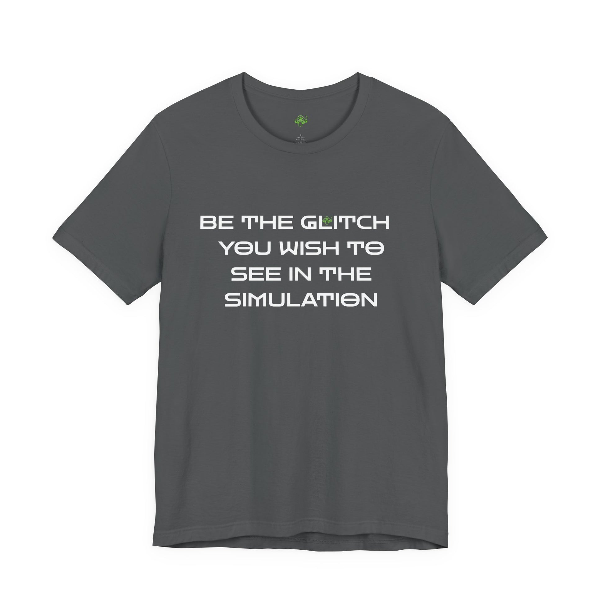 For the cosmic clown philosophers and digital witches. “Be the Glitch You Wish to See in the Simulation” riffs on meme mysticism and existential absurdity. Printed in Zen Dots on washed charcoal cotton with a hidden mushroom. Reality is optional. Statement shirt for cosmic clowns, digital witches, and absurd philosophers. Hidden mushroom sigil included.
