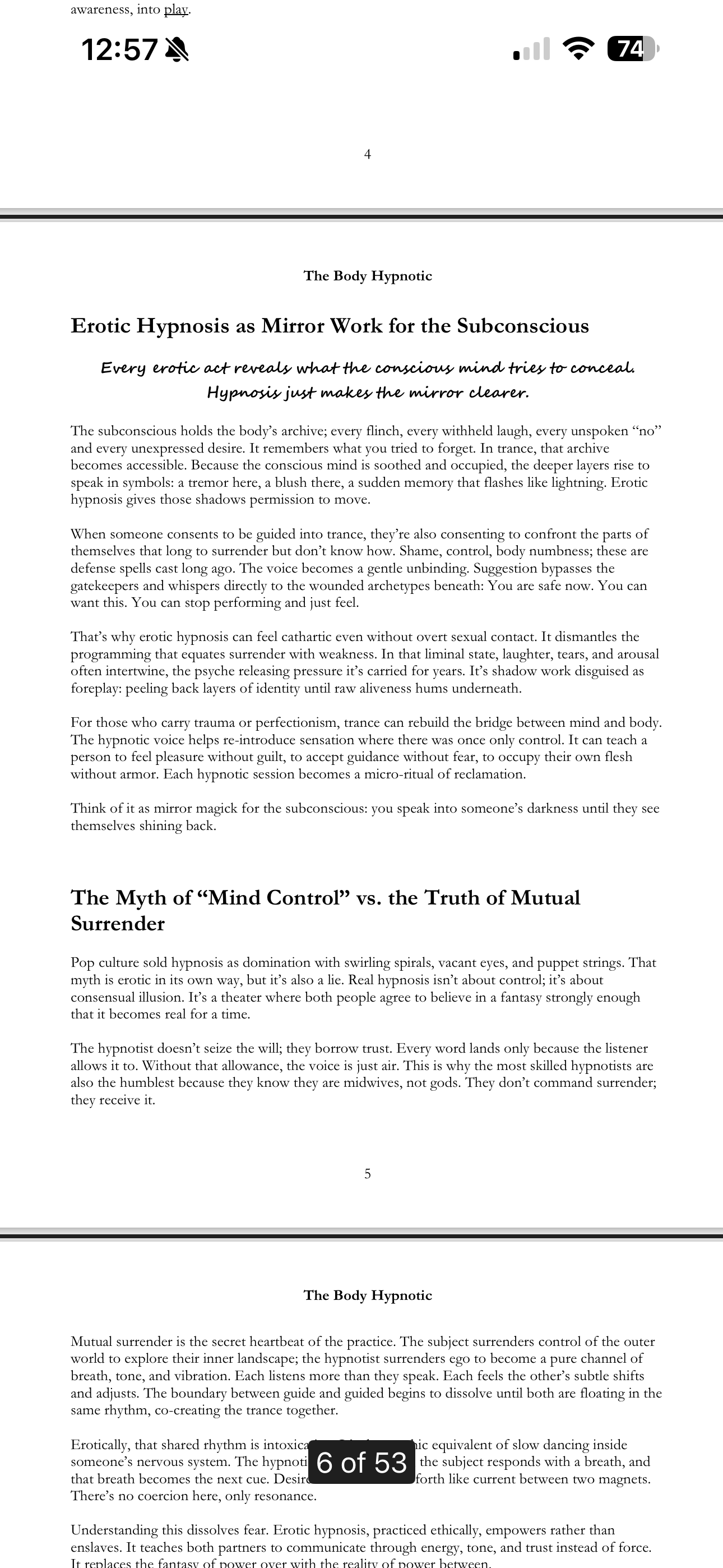 Through seven immersive chapters and five full trance rituals, you’ll learn how to guide a lover, partner, or yourself into hypnotic states that open the body, soften the ego, and awaken the soul’s hunger for connection. Whether you’re curious, experienced, or simply craving something more magickal than the usual bedroom script, this guide invites you to explore erotic trance as a path of pleasure, healing, and shadow integration.